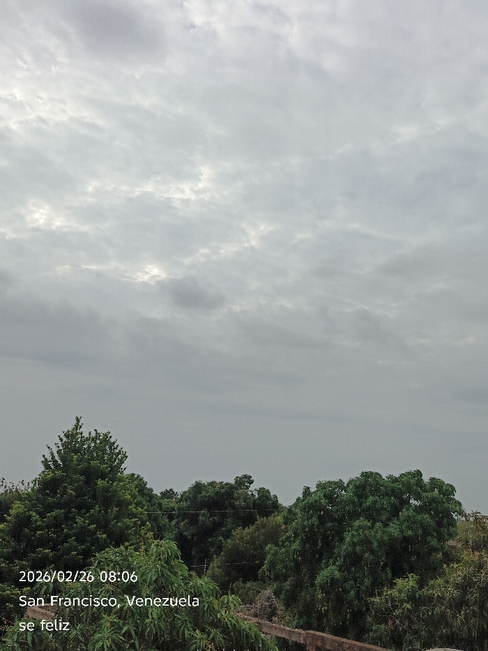 This image depicts an outdoor, elevated view over a dense canopy of trees under an overcast sky, located in San Francisco, Venezuela, on February 26, 2026, at 08:06. The upper two-thirds of the frame are filled with a grey, cloudy sky, exhibiting diffuse light and varied cloud formations. The lower third features a dense expanse of green foliage, comprising numerous trees with full canopies, displaying different shades of green. A dark, linear structure, possibly a concrete or wooden railing, is partially visible at the very bottom edge, obscured by foreground leaves. Faint utility lines are discernible horizontally within the tree line on the right side. No individuals, animals, or specific actions are depicted in the scene. The Spanish phrase "se feliz" is present as a text overlay in the lower left corner.