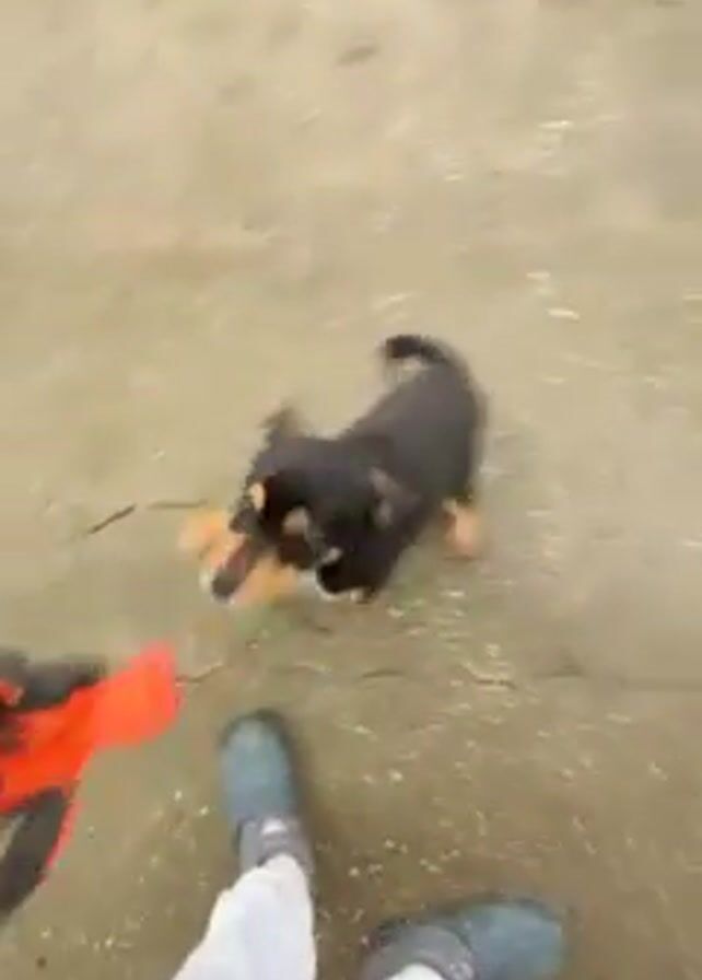 A person is holding an orange and black dog toy while standing on a concrete surface. A small black and tan puppy plays with the toy, jumping around the person's feet. The person is wearing light blue clogs, white pants, and a black jacket. The surface has a mottled grey color with cracks. The puppy enthusiastically sniffs and interacts with the toy.
