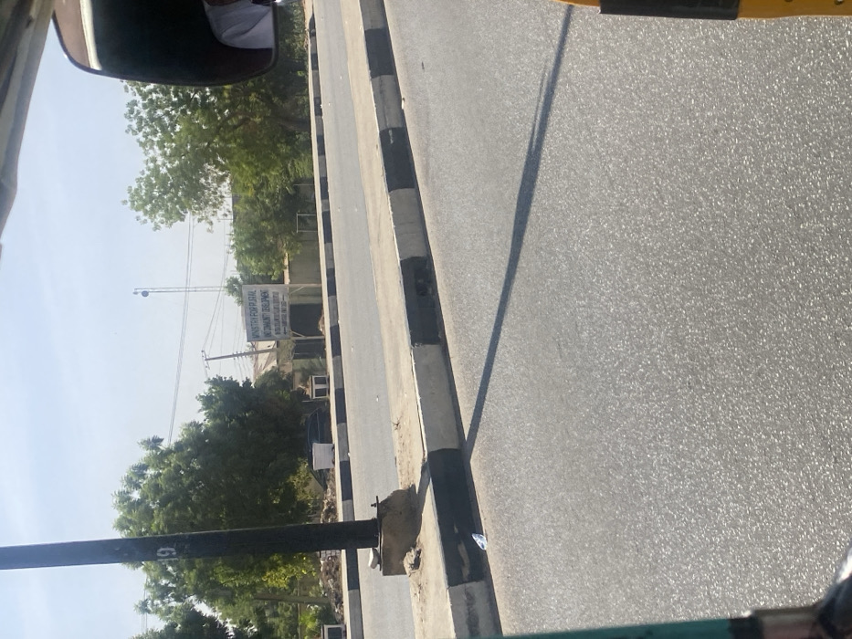 This image depicts a daytime street scene in Dorayi, Nigeria, observed from the interior of a vehicle. The foreground features a multi-lane asphalt road, divided by a median strip composed of alternating black and white concrete curbs and rectangular blocks. A tall, black utility pole is positioned on the left side of the road, partially obscured by the vehicle's frame. On the right, a white rectangular sign is visible behind the median, displaying text that includes "MINISTRY FOR RURAL AND COMMUNITY DEVELOPMENT" and "DORAWA COMMUNITY DEVELOPMENT". Beyond the road and median, a mixture of green trees, fences, and various buildings under a clear, bright sky are present, with a tall antenna structure in the distance. Sunlight casts strong shadows across the asphalt. A small white plastic bottle lies on the road near the curb in the midground. The reflection of an individual's head and shoulder, wearing a white collared shirt, is visible in a vehicle side mirror in the upper right quadrant. No explicit actions or interactions are discernible from the depicted individuals.