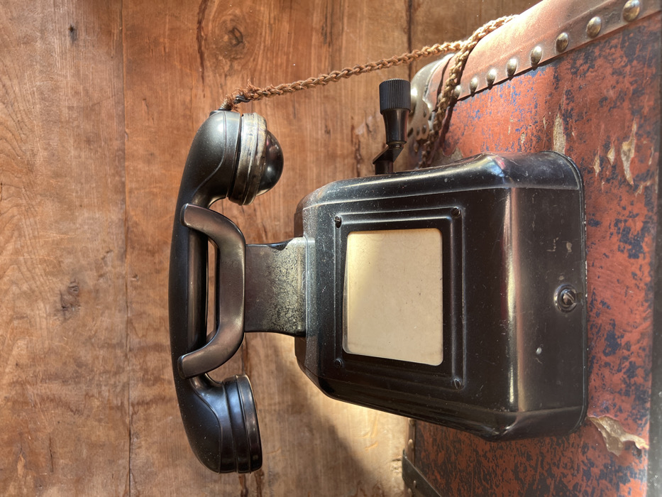 An antique, black, desk-style telephone is centrally positioned against a rustic wooden plank wall