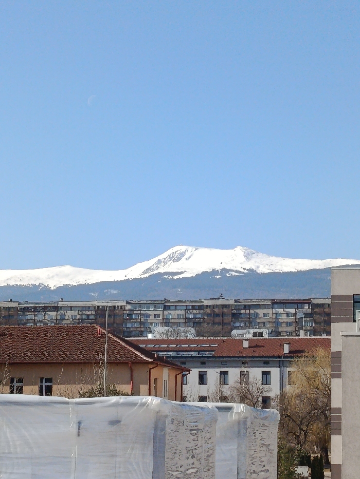 The image displays an urban and natural landscape in Sofia, Bulgaria, with Vitosha Mountain prominent in the background