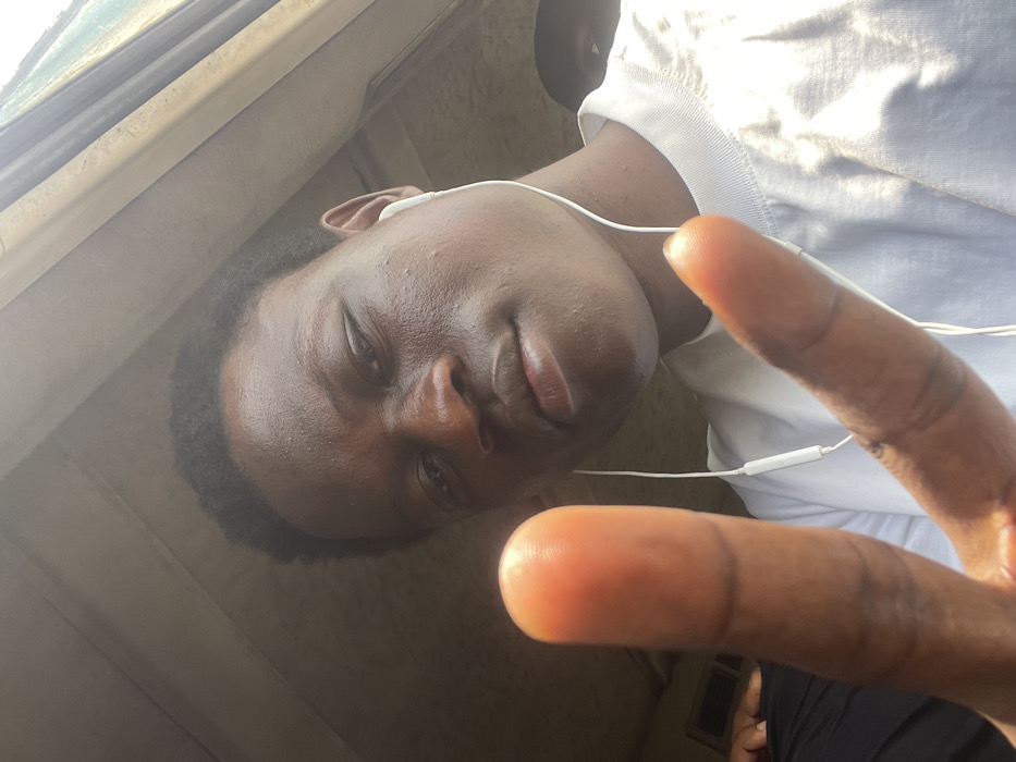 A close-up, front-facing image shows a young individual, appearing male, with dark skin and short dark hair, posing within an enclosed space in the city of Aiyetoto-Asogun, Nigeria
