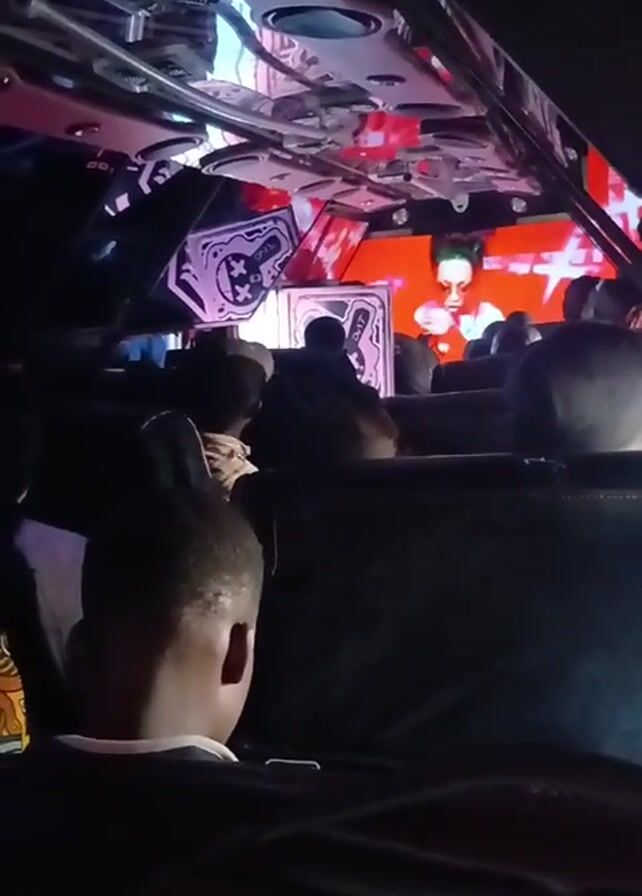 The interior of a brightly lit, elaborately decorated vehicle, possibly a bus or van, is shown in this video. Several passengers are visible, some looking at their phones and others engaged in conversation. The ceiling is highly decorated with circular designs, neon pink accents, and integrated video screens. The seats appear to be dark-colored, and the overall lighting creates a colorful and vibrant atmosphere within the vehicle. The video is shot from a low angle, focusing on the back of the heads of some of the passengers.