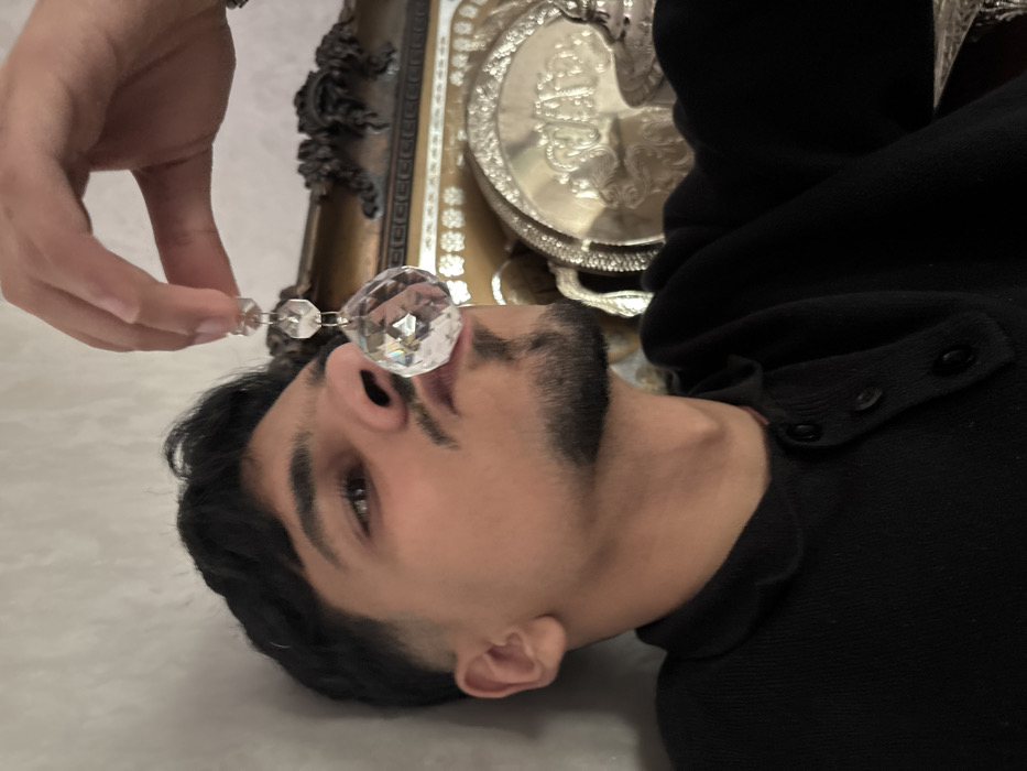A man with a light skin tone, short dark hair, and a beard lies on his back. He is wearing a black shirt or sweater with buttons at the collar. A hand holding a decorative crystal ball is placed above his nose. Behind him, a portion of an ornate, silver-colored tray and a decorative frame are visible. The background appears to be a neutral-colored surface.