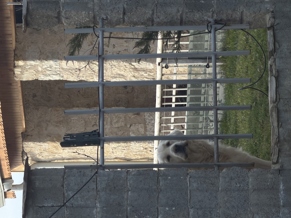 A light-furred, large-breed dog, likely a Golden Retriever, is partially visible in the mid-ground of a daytime scene in Priseltsi, Bulgaria. The dog's head and upper torso are positioned behind the vertical bars of a gray metal fence, its gaze directed forward with a placid expression. This metal fence is set within an opening in a gray concrete block wall, which forms the immediate foreground. A black cable is secured to the metal bars. Behind the dog, green grass is visible, followed by a lighter-colored horizontal railing and an indistinct dark object further back. The background features a building constructed of light-colored, possibly stone or stucco, material, exhibiting prominent vertical architectural elements. Wooden eaves with visible rafters are present at the top of the building, and a white security camera with an attached downspout is mounted near the roofline on the upper left. The environment is naturally lit, suggesting daylight conditions.