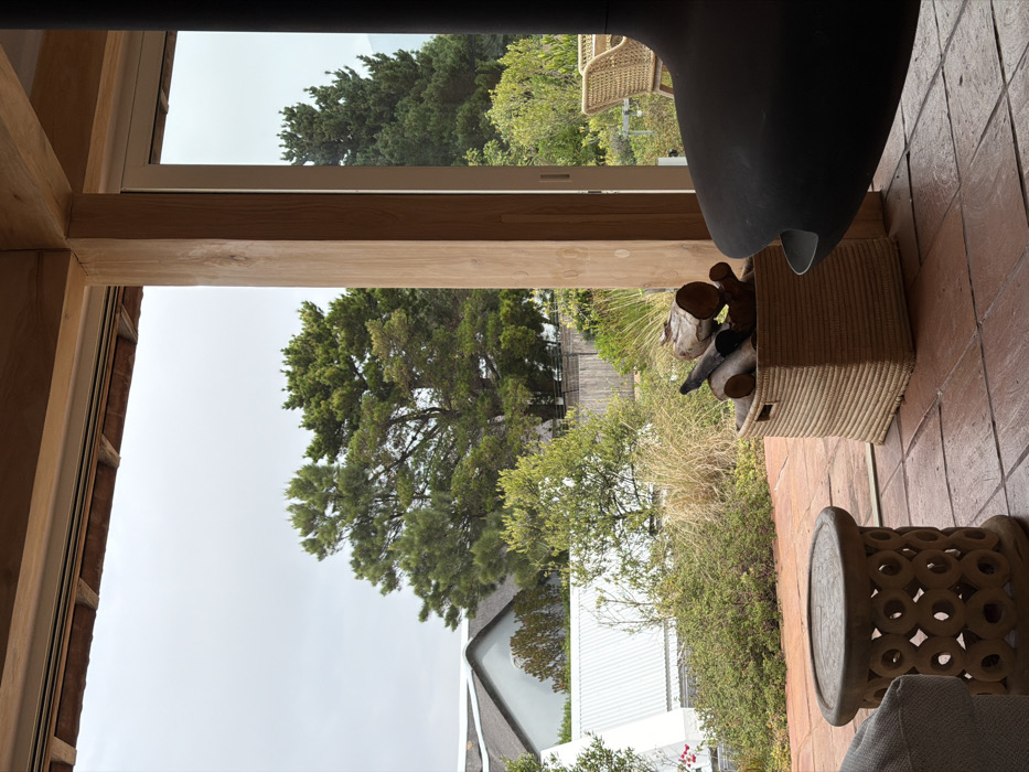- "The image displays a detailed view from a covered patio or indoor-outdoor living area looking out onto a garden and neighboring properties in Hout Bay, South Africa" by FM-tYDL83, licensed under CC BY 4.0