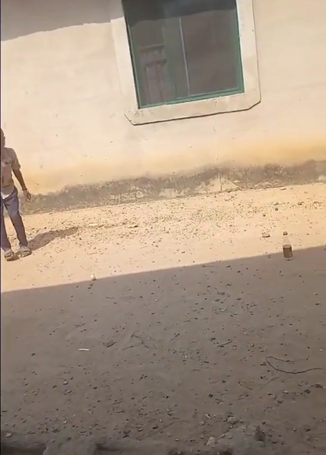 A young boy is walking on a dirt and sand-covered surface. He performs a split and falls to the ground. The surface is in front of a light-colored building with a green-framed window. A small brown bottle is on the ground nearby. The scene is outdoors with dappled sunlight.