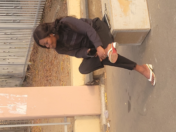 A woman in a dark long-sleeved shirt and dark pants sits on a concrete ledge. She holds a phone in her left hand and looks down. Her left leg is crossed over her right. She wears white flip-flops with a small, gold heel on her right foot, and a red and white heeled sandal on her left. A metal fence is behind her, with fallen leaves on the ground. A light pink wall runs horizontally across the bottom of the image.