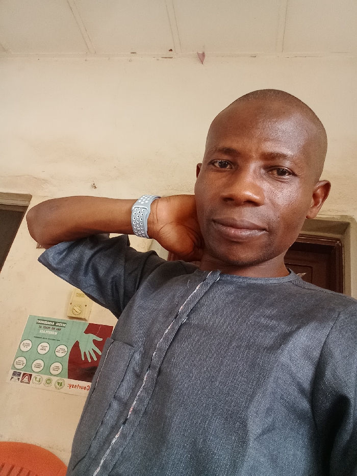 An adult male, bald and with dark complexion, is depicted in a medium-shot, facing forward with a neutral expression. He wears a dark grey, long-sleeved traditional garment with vertical stitched detailing on the front. His right arm is bent, with his right hand resting behind his neck. A light grey, perforated silicone wristband is visible on his right wrist. The background features a light-colored, possibly cream or off-white, interior wall exhibiting some wear and marks. To the subject's left, a green and white poster is affixed to the wall, displaying text including "SEXUAL HARASSMENT HAS NO PLACE IN OUR WORKPLACE" and "COURTESY," alongside a graphic of an outstretched hand. Above the poster, a light-colored rectangular object is mounted on the wall. A dark brown door frame is partially visible on the right side of the image. The ceiling, also light-colored, shows minor imperfections, and a small, light pink, triangular object is visible near the top left corner of the ceiling. A reddish-orange object is partially visible in the bottom left foreground. The scene is located in Lokoja, Nigeria, likely within a public building or workplace.