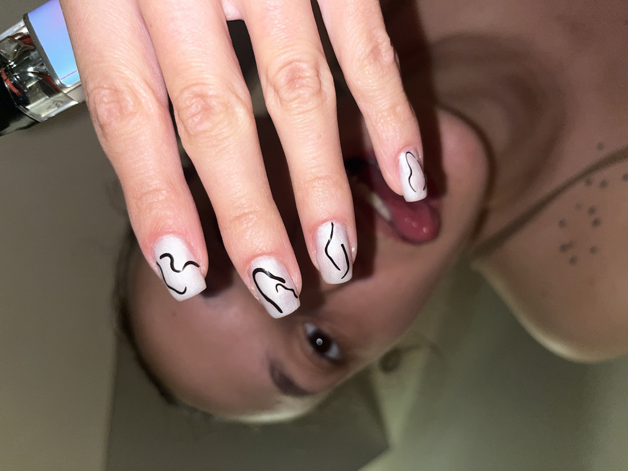 A close-up, selfie-style photograph presents a woman holding her hand close to the camera, showcasing her nails with a white base and abstract black line art