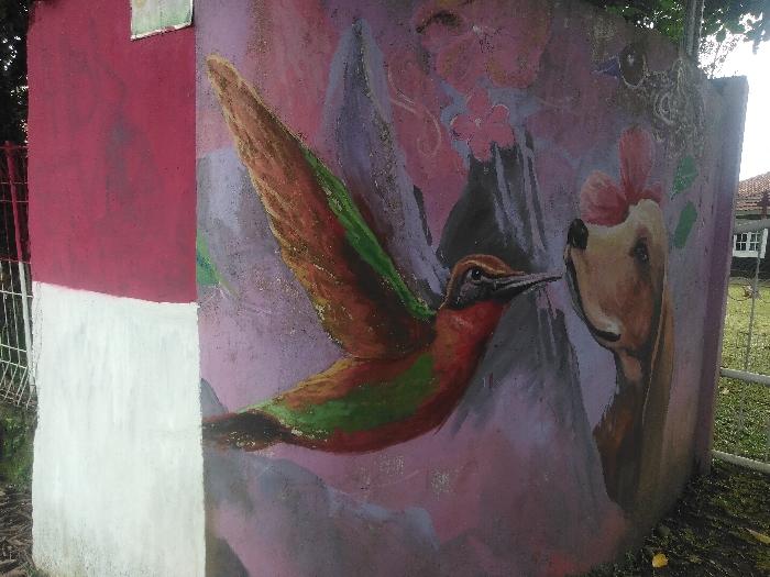 A forensic image details a curved concrete structure in Gharee, Nepal, adorned with a painted mural. The mural features a hummingbird-like bird with a dark head, red throat, and wings displaying red, orange, and green plumage, positioned centrally and facing right with its long beak extended. To the right of the bird, a light brown animal head, resembling a dog or deer, with a pink bow on its left ear, faces left, appearing to observe the bird. The mural's background is a stylized purple-pink with dark, possibly mountainous forms and several pink floral designs. The adjacent side of the concrete structure, forming a corner, is painted in two horizontal bands: solid red on top and solid white on the bottom. To the immediate left of this red and white section, a white grid-patterned metal fence is visible. Overhead and in the upper left background, green tree foliage is apparent. To the right of the mural, a patch of green grass is visible, and in the distant background, a building with a reddish-brown tiled roof and white-framed windows is present.