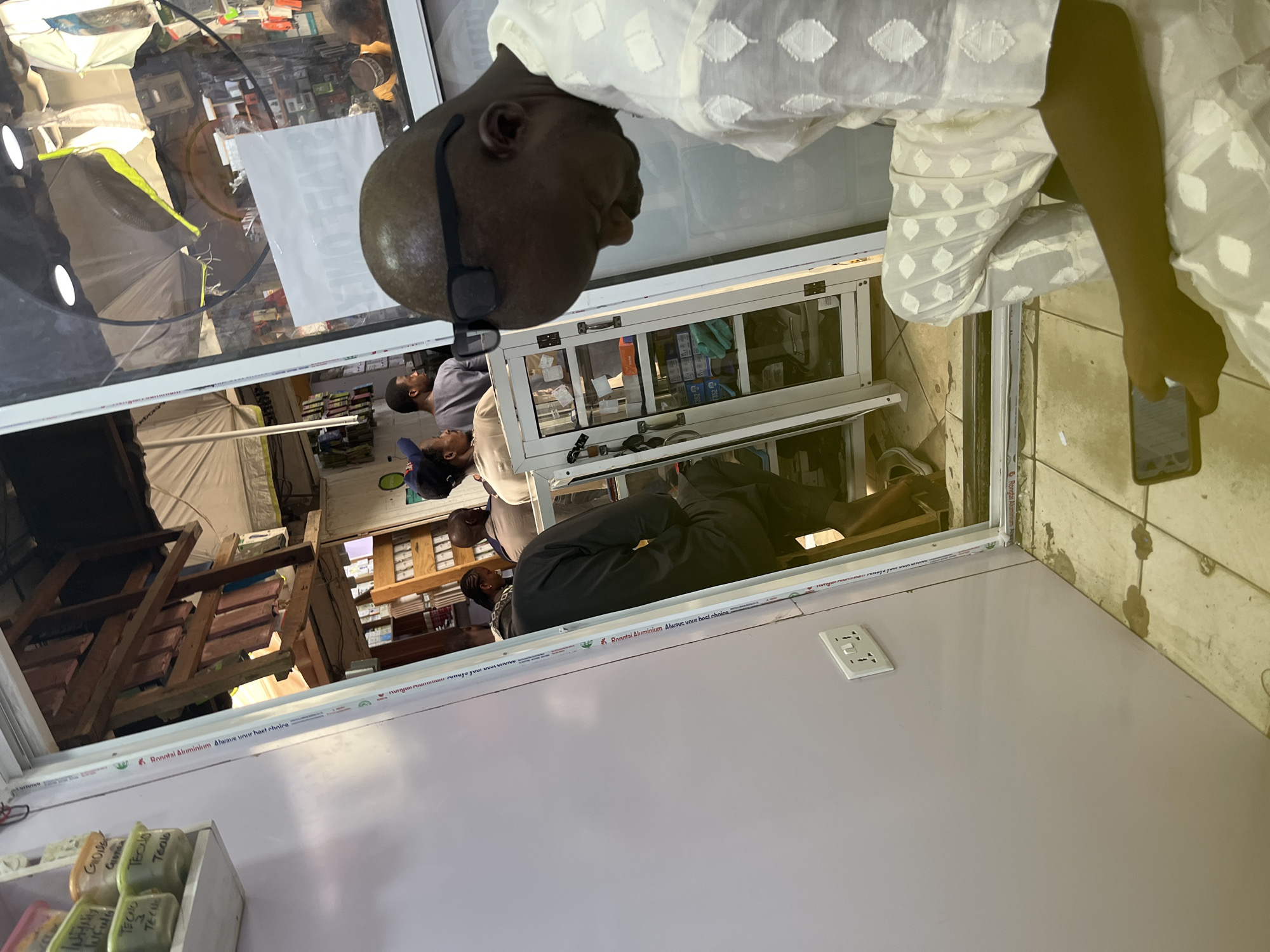 The scene is an interior view of a commercial space, likely a mobile phone accessories or repair shop, situated within a market in Abuja, Nigeria