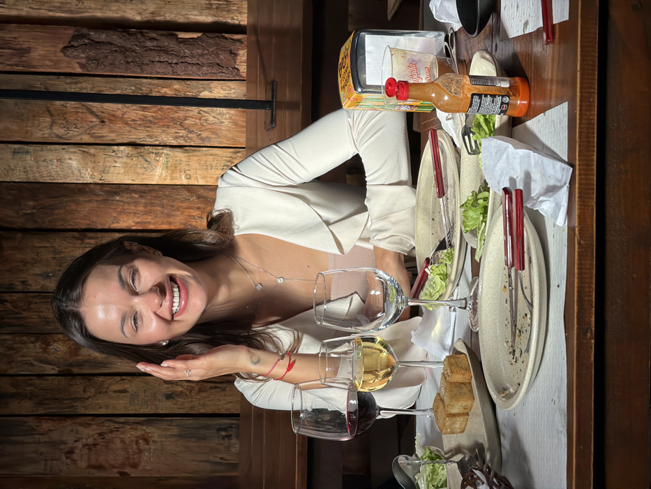 A smiling woman in a white blazer sits at a wooden table. There are three wine glasses with red, white, and clear liquid respectively. Also on the table are partially eaten plates of food, a bottle of hot sauce, a napkin holder, and a black bowl. The background is a textured wooden wall.