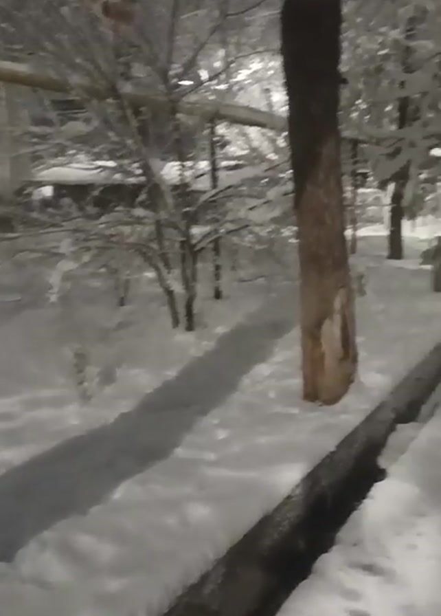 The camera pans up to reveal a snow-covered street at night