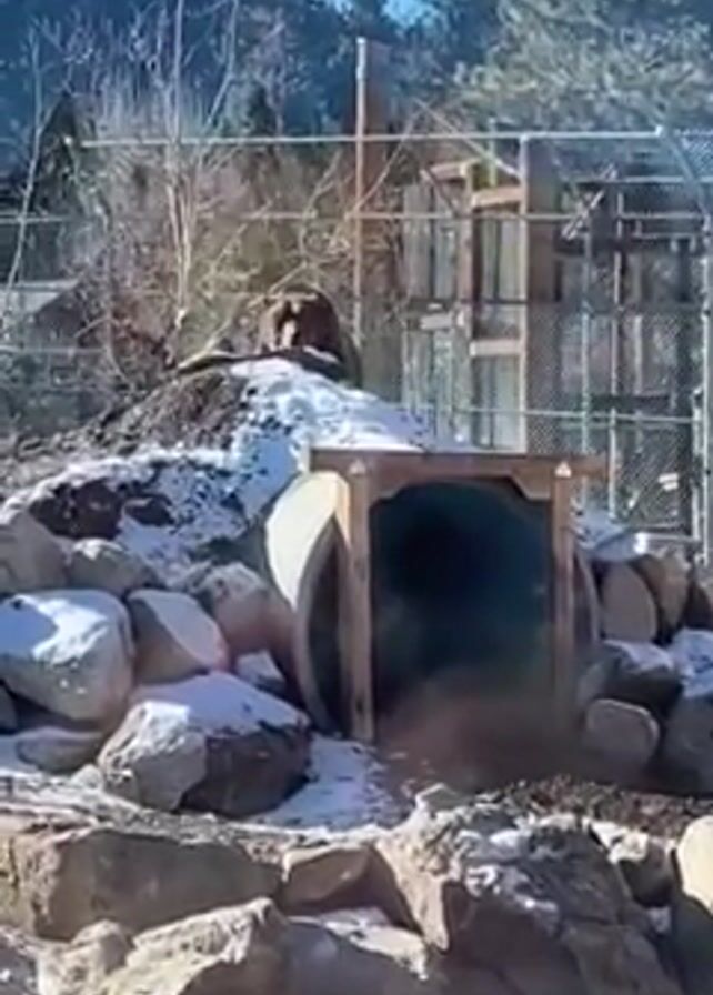 bear in an enclosure at a zoo or wildlife park. The bear is lying on a small hill covered in snow, with a large culvert pipe nearby. In the background, there is a fenced enclosure and some trees. The sky is blue. There is a small pond in the foreground. The video appears to be taken from behind a glass barrier. The person recording speaks in Spanish, mentioning that they would like to see the bear up close.