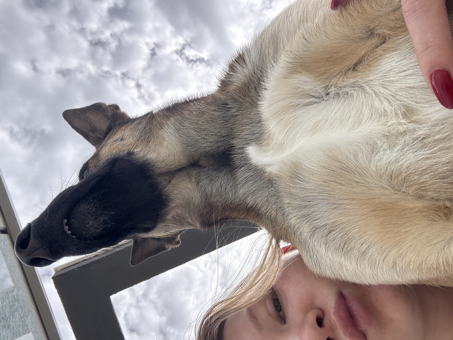 The image, reportedly located in the city of Ariel, Palestinian Territory, captures a low-angle perspective of a person embracing a dog against a cloudy sky backdrop. On the left, a portion of a person's face is visible, characterized by fair skin, light blonde hair framing the left side of the face, a visible left eye, and lips pursed forward. A hand, also belonging to this individual and adorned with red nail polish, is seen in the lower right corner, resting on the dog's fur. The central and dominant subject is a medium-sized dog, possibly a German Shepherd or similar breed, facing upwards and slightly to the right of the frame. Its fur displays shades of tan, brown, and lighter cream, with a darker black muzzle. The dog's mouth is slightly open, revealing several small front teeth. Its ears are erect. In the upper left background, a dark grey or black angular architectural element, possibly a beam or overhang, is visible. The sky behind the subjects is overcast with white and grey clouds.