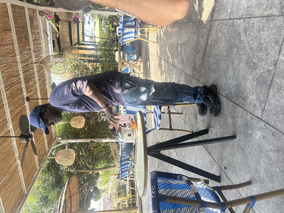 An African American man in a blue shirt, jeans, and a baseball cap stands beside a round table at an outdoor cafe. Woven blue and white chairs surround the table, which holds glasses and other items. The cafe has a bamboo ceiling with hanging lamps and a ceiling fan. Trees and other greenery are visible in the background. The ground is paved with concrete.