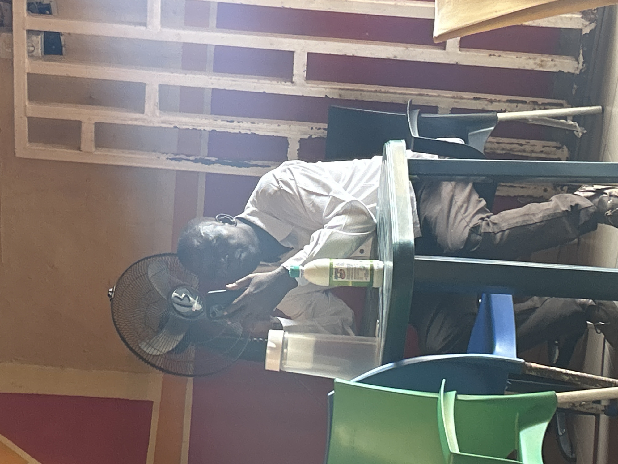man wearing a white shirt and brown pants, looking at a mobile phone while sitting on stacked green and blue chairs. There is a bottle on the chair shelf next to him, and an electric fan is beside him. In the background, a red and white brick wall is visible. The location is Bukuru, Nigeria.