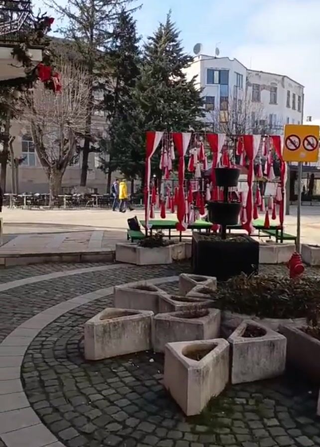 n outdoor plaza in a town. The plaza is paved with cobblestones arranged in concentric circles around a central structure. This structure consists of a low, tiered planter with plants growing out of it, surrounded by a ring of triangular concrete planters. Behind the central planter is a temporary decorative structure made of a dark metal frame supporting alternating red and white striped fabric panels. Small tassels hang from these panels. Several people are seen walking across the plaza. One person is wearing a yellow jacket. The plaza is bordered by buildings. One building has a red facade with large windows. Another building has a large advertisement banner hanging on it. A "no smoking" sign is also visible in the scene. The sky is blue with some clouds. Several trees are also visible.