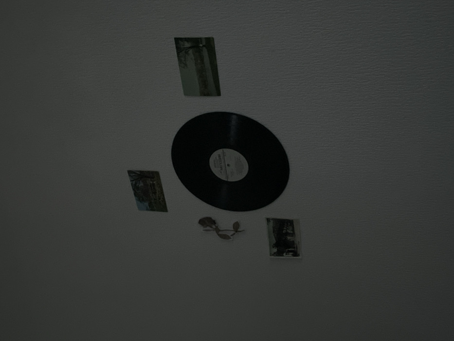 The image depicts a dimly lit interior wall, characterized by a light color and subtle texture. A black vinyl record is centrally mounted on the wall; its label, partially legible, bears text that appears to include "ST. PETERSBURG," indicating a connection to the city in Russia. Surrounding the record are four additional objects. To the upper left, a small rectangular photograph or print displays a landscape featuring deciduous trees. To the upper right, another small rectangular photograph presents a body of water with trees on the distant bank under an overcast sky. Below the record, to the left, a third small rectangular photograph depicts a group of people standing outdoors, with architectural elements indistinctly visible in the background. To the immediate left of the record, situated between the upper-left and lower-left photographs, a single, dark-colored object resembling a dried or artificial rose on a stem is affixed to the wall. No living individuals are present in the immediate scene, and no active interactions or specific actions are occurring.