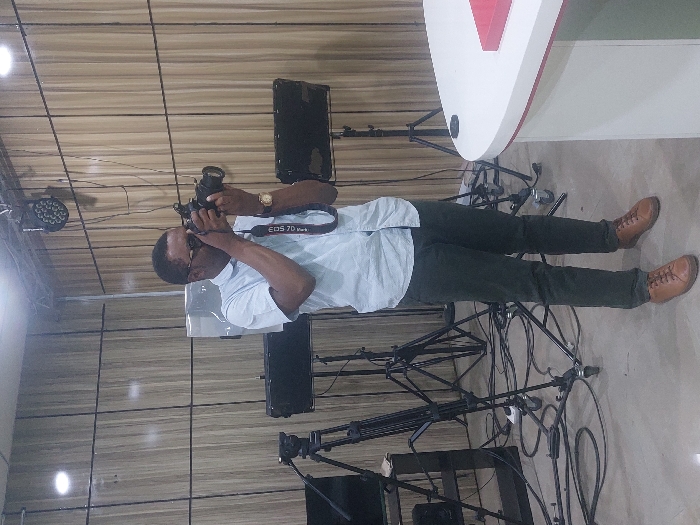 The image depicts an indoor media production environment, likely a photography or television studio, in what appears to be a city in Nigeria, though the exact location within Jos cannot be determined from the visual information alone