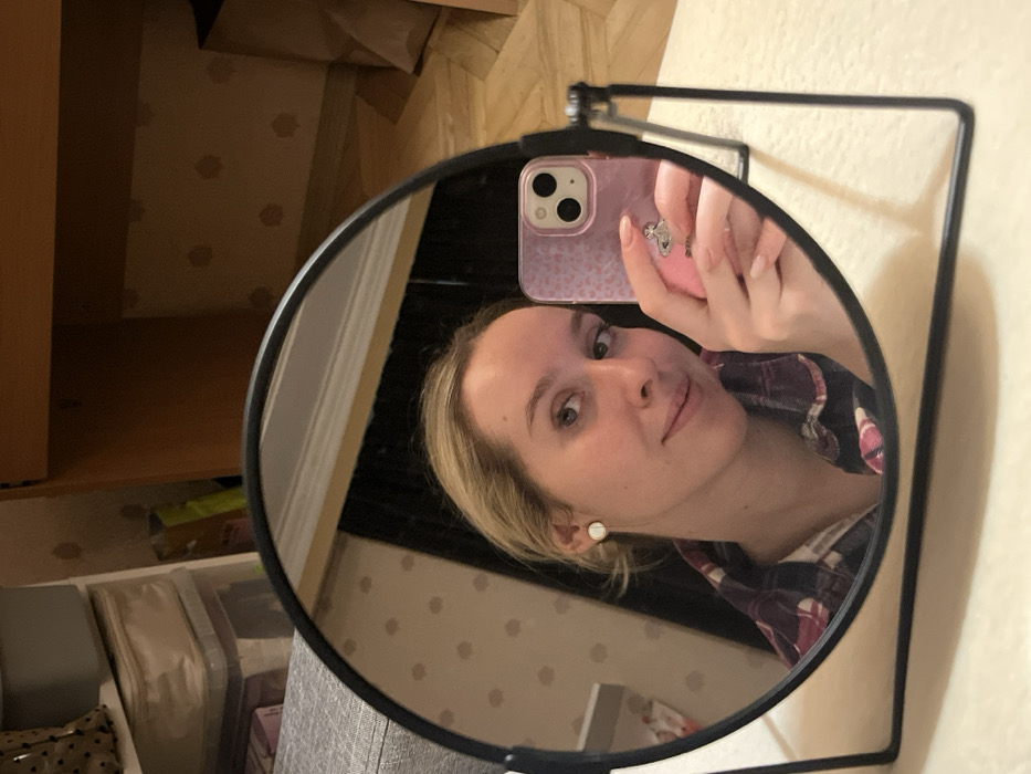 This image presents a young adult female's reflection in a circular desktop mirror, situated in an indoor setting within Minsk, Belarus. The female, with light-colored hair, is wearing a dark and light-toned plaid shirt and a white circular stud earring in her visible left ear. Her right hand holds an iPhone, encased in a pink, patterned protective cover featuring a silver-colored orb emblem, angled towards the mirror to capture her reflection. The iPhone's triple camera system is visible on its rear. Her gaze is directed towards the phone, and she exhibits a slight smile. The background, visible through the mirror's reflection, includes a wall covered in light-toned wallpaper with a repeating, darker patterned motif. To the left, a gray upholstered surface and stacked clear plastic storage containers are visible. To the right, a section of light-colored wooden furniture (desk or shelving unit) is present above a wooden parquet floor.