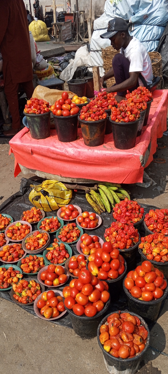 The image depicts an outdoor market stall in Awjaw, Nigeria, featuring a large display of fresh produce