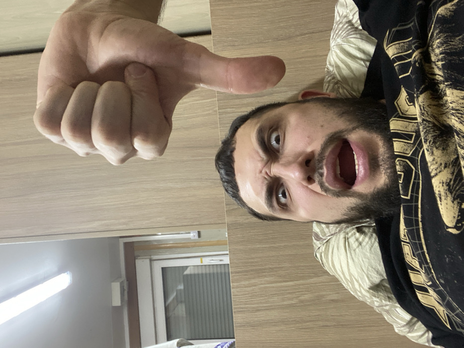 An interior scene, purportedly in Koskolovo, Russia, though the specific location within the city is indeterminate from visual cues. A male individual with dark hair and a beard occupies the lower frame, displaying an exaggerated facial expression characterized by wide eyes, a furrowed brow, and an open mouth. He wears a black long-sleeved shirt featuring a light-colored graphic design across the chest. A pillow with a subtle pattern supports his head. Above and to the right of the man's head, a hand executes a "thumbs down" gesture. The background consists of light wood-grain paneling or cabinetry. Overhead, a rectangular fluorescent light fixture is illuminated. A white-framed window or interior door with horizontal blinds is partially visible in the upper left background, accompanied by a white electrical outlet below it.