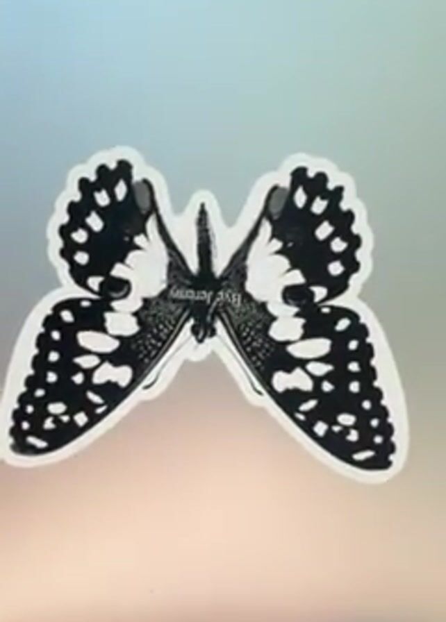 A still shot shows a sticker of a butterfly with black and white patterns on a light gray surface, possibly a laptop