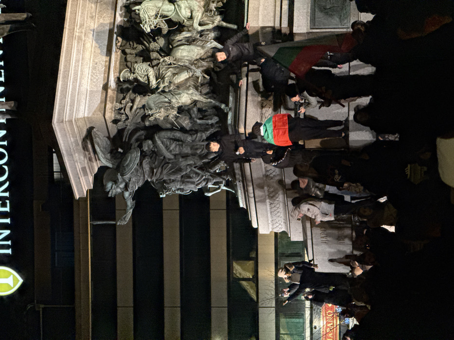 People are standing on the base of a monument, next to a building with "INTERCONTINENTAL" in large letters. Some are draped in what appears to be a Bulgarian flag. The monument depicts a group of figures, including horses. The scene is captured at night, with significant shadow.