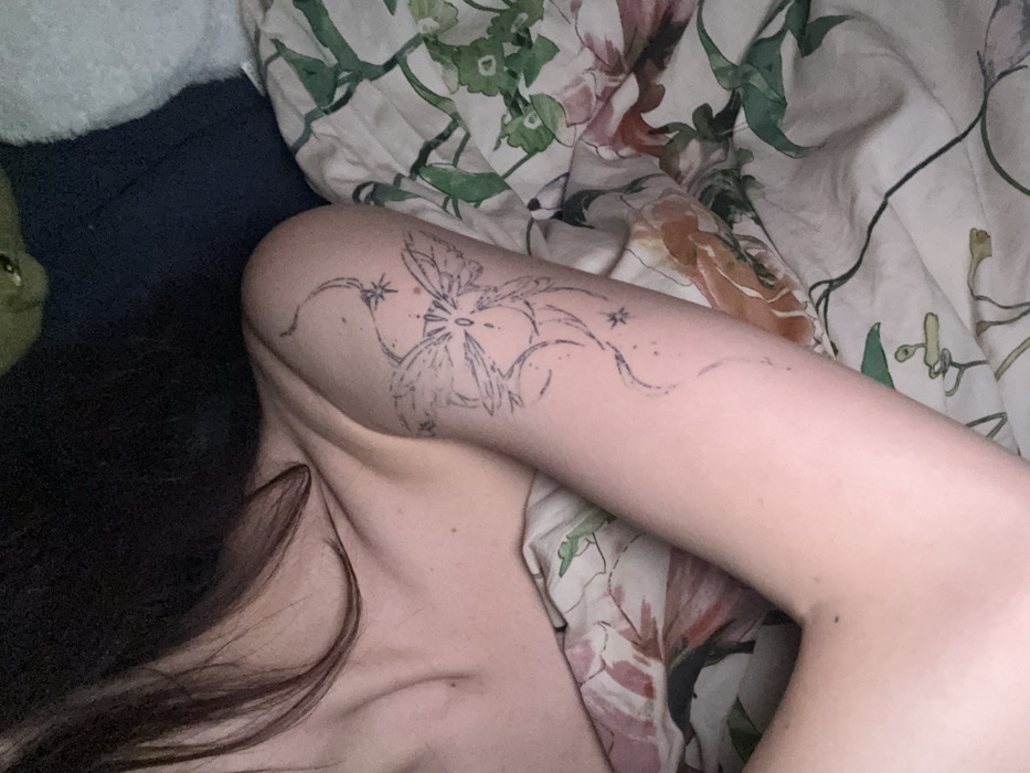 A person's arm with a floral tattoo is visible, lying on a patterned bedsheet