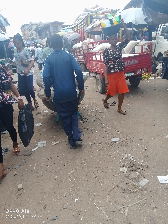 This image depicts a bustling outdoor market scene in Onitsha, Nigeria. The ground is an uneven, light brown dirt path, covered with scattered debris including small stones, plastic fragments, and organic matter. In the left foreground, a woman is partially visible, wearing a dark patterned top and dark pants with gold-colored sandals on her left foot, holding a black plastic bag in her left hand. To her right, a man, seen from behind, wears a dark blue long-sleeved shirt and dark blue pants, pushing a two-wheeled metal cart loaded with several large, light-colored sacks. In the mid-ground, to the right of the man with the cart, a woman walks towards the right side of the frame. She wears a black and white polka dot top and an orange skirt, with light brown sandals. She balances a dark basin containing multiple colorful plastic bottles or jars on her head, steadying it with her left hand. Behind these individuals, a red three-wheeled cargo vehicle, labeled "YAOJIN," is heavily loaded with numerous large white sacks. The background reveals a crowded market environment with multiple people, some walking, others near stalls or vehicles. Structures with improvised shelters, including open umbrellas and tarpaulins, are visible, along with a multi-story building with a red roof in the far distance. The overall lighting is diffused, indicating an overcast sky.