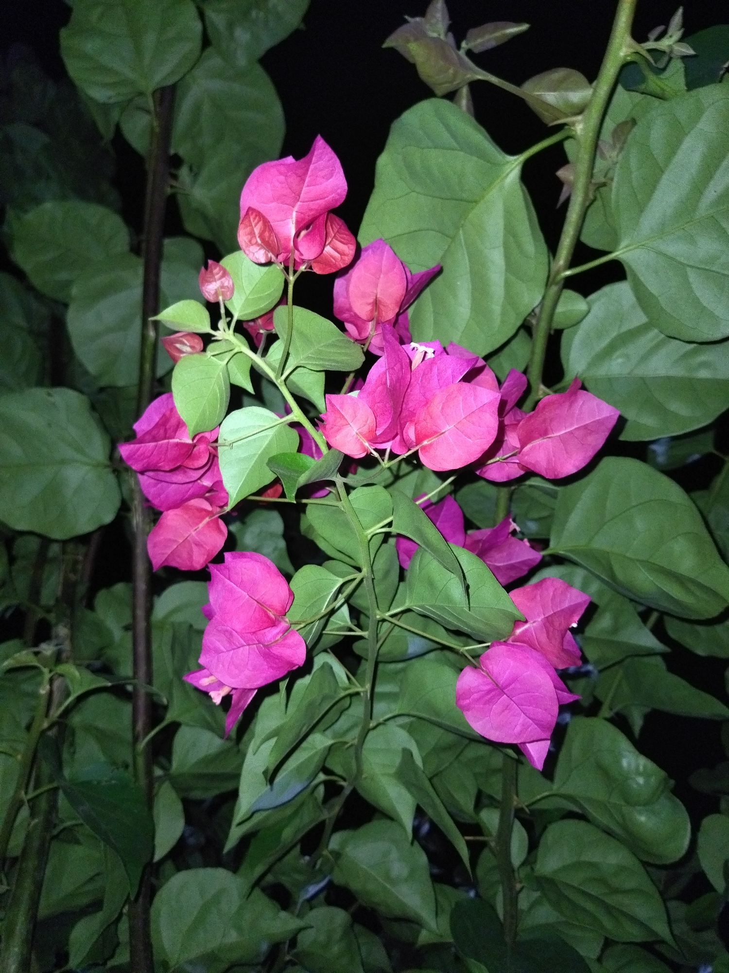 bougainvillea plant with pink flowers and green leaves. The plant is in Tinaquillo, Venezuela. The background is dark.