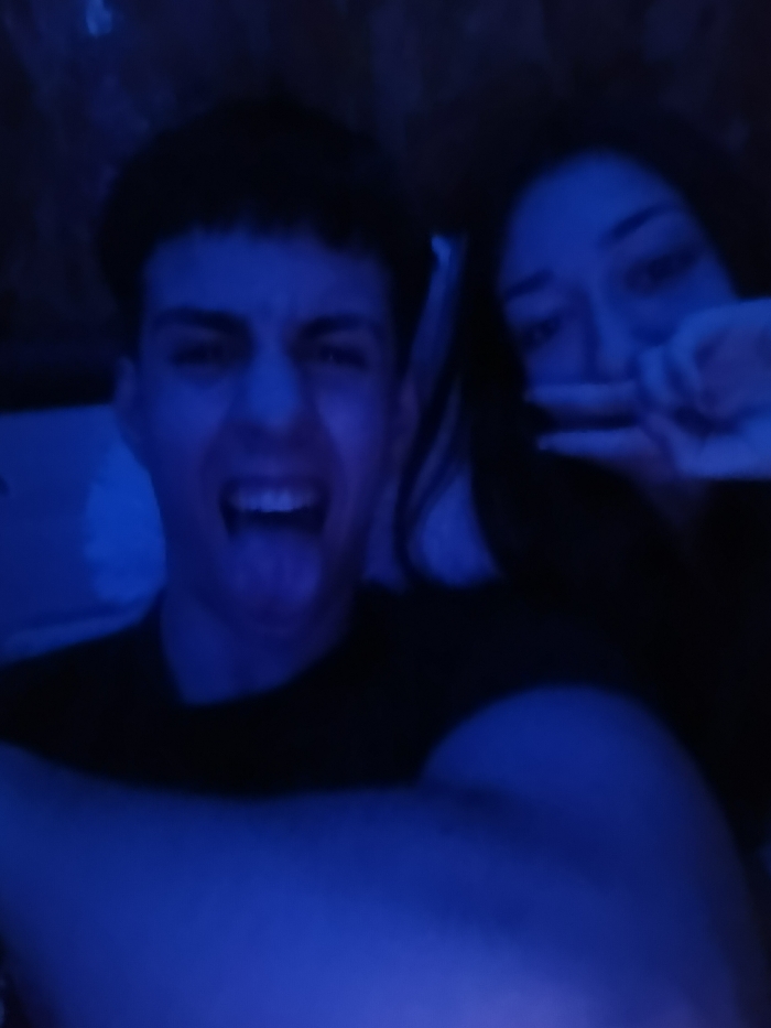 A low-resolution, heavily blue-tinted image depicts two individuals in close proximity, likely a selfie or close-up photograph taken in low light