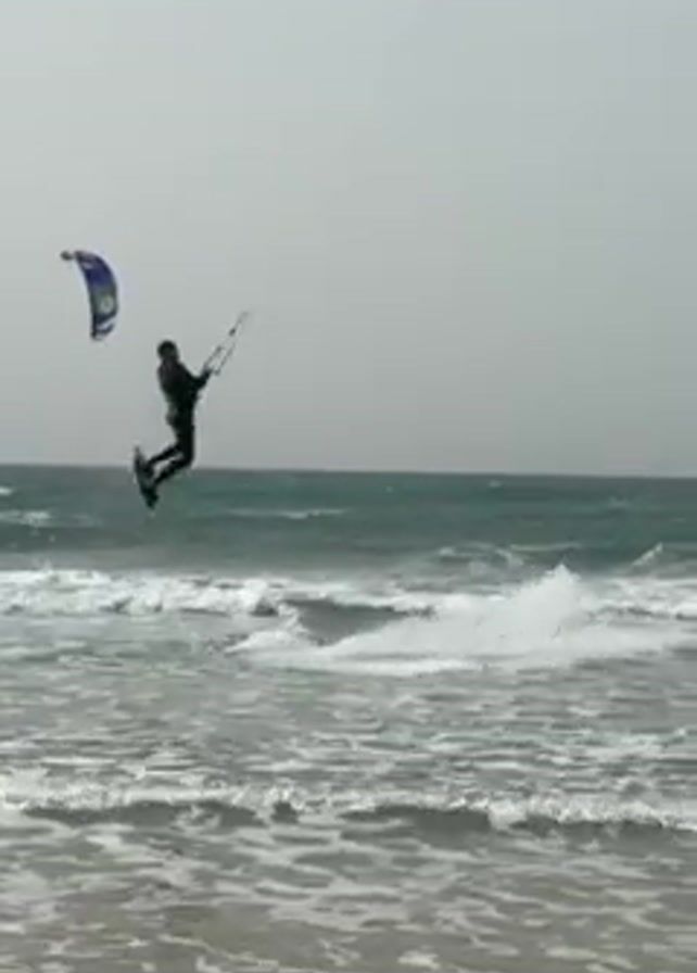 kitesurfer performing a jump in an ocean setting. The individual, clad in a dark wetsuit, is riding a kiteboard and holding onto a kite. They launch themselves into the air, executing a jump with other kitesurfers and kites visible in the background. The water is choppy with small waves, and a breakwater is seen in the distance. The sky is overcast, creating a flat, grey light. The footage is captured from the beach.