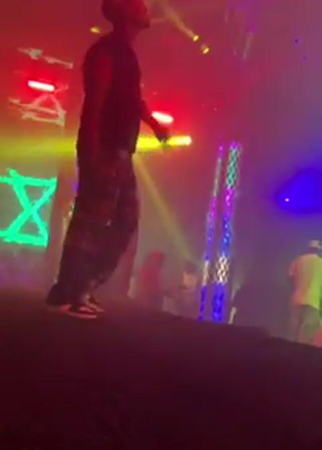 A man is seen from the back, standing on a dark platform with bright neon stage lights and a light haze behind him. He is wearing dark pants with a patterned design, dark shoes with white soles, and a dark top. He holds a microphone in his right hand and appears to be rapping or performing. There are other people visible in the background, and decorative light fixtures are visible. The lighting primarily consists of red, green, and yellow hues. The camera angle is low, looking upward towards the stage. The camera shifts slightly throughout the recording.
