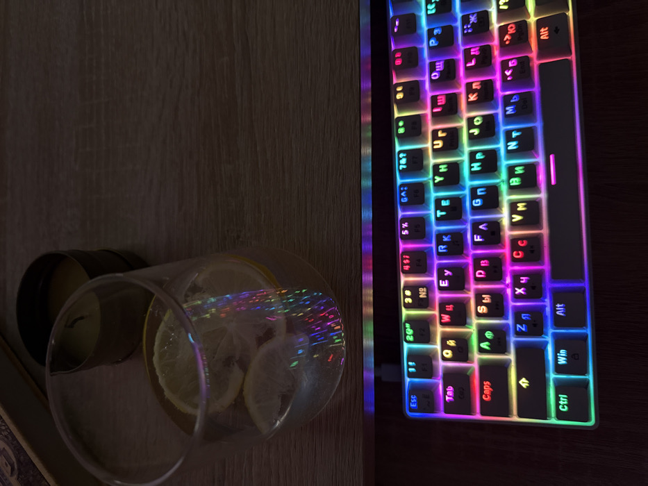 An overhead, slightly angled shot depicts a desktop setup in a dimly lit indoor environment in Unknown, Unknown. The primary focus is a white mechanical keyboard with rainbow RGB backlighting positioned at the bottom of the frame. The keycaps feature both Latin and Cyrillic alphanumeric characters. Above the keyboard, a clear glass contains water and multiple lemon slices. A vivid, multi-colored light streak, appearing iridescent, is visible inside the glass, resulting from the reflection and refraction of the keyboard's RGB lighting. To the left of the glass, a dark, cylindrical container, possibly a candle holder with a yellowish substance inside, rests on the wooden surface. A portion of a dark, embossed object, potentially a book, is visible in the top-left corner. The environment appears to be a personal workspace or leisure area. No individuals are present.