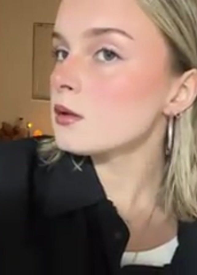A young woman with fair skin and blonde hair is looking to her left and slightly upward in a dimly lit room. She is wearing large hoop earrings, a dark jacket over a white top, and makeup that includes blush and lip gloss. The room has a casual, lived-in feel with a couch, art on the wall, and a clothes drying rack visible in the background.