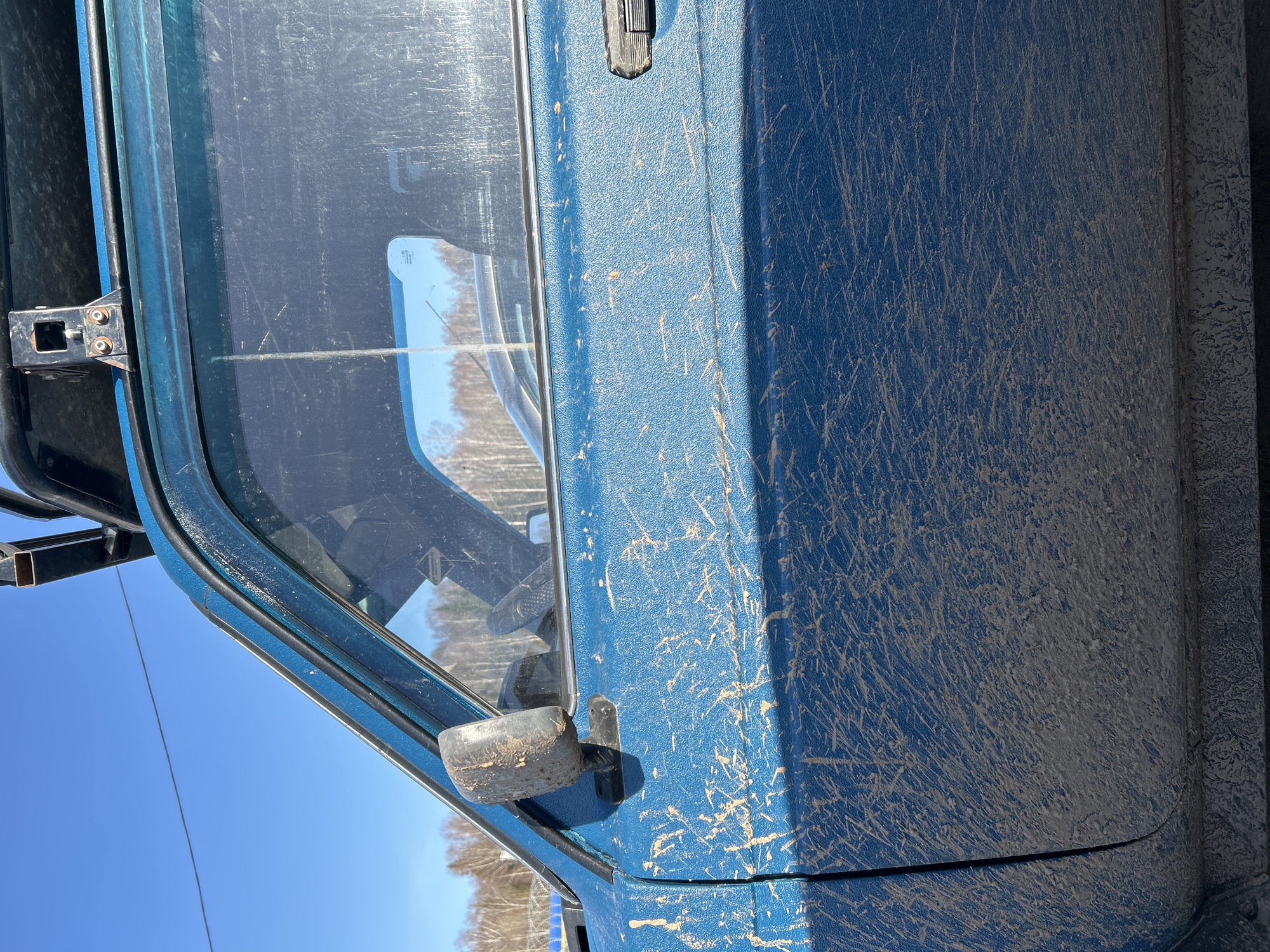 A close-up, outdoor, daytime shot depicts the side of a blue vehicle, heavily splattered with mud
