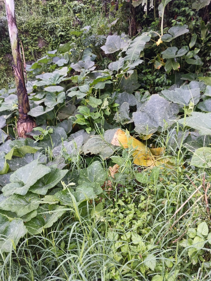 - "Lush greenery fills the frame, dominated by large, round pumpkin leaves interspersed with tall grasses and smaller foliage" by FM-vSkrf2, licensed under CC BY 4.0