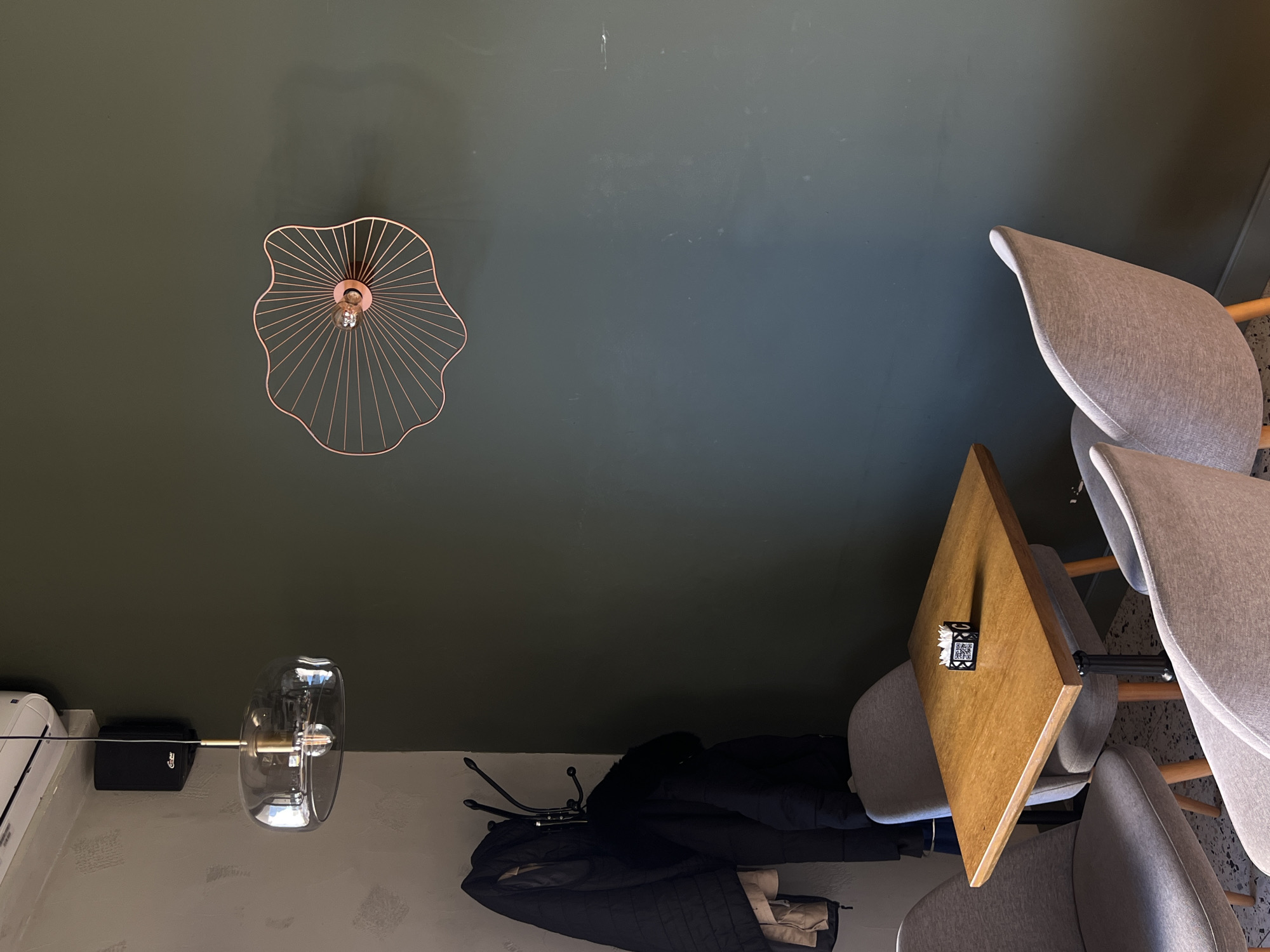 n interior view. A dining table with four chairs is visible. A coat rack with jackets and coats is near the table. Above, there are two light fixtures, one with a copper flower-like design and another with a glass dome. The setting could be a restaurant or cafe in Podgorica, Montenegro.