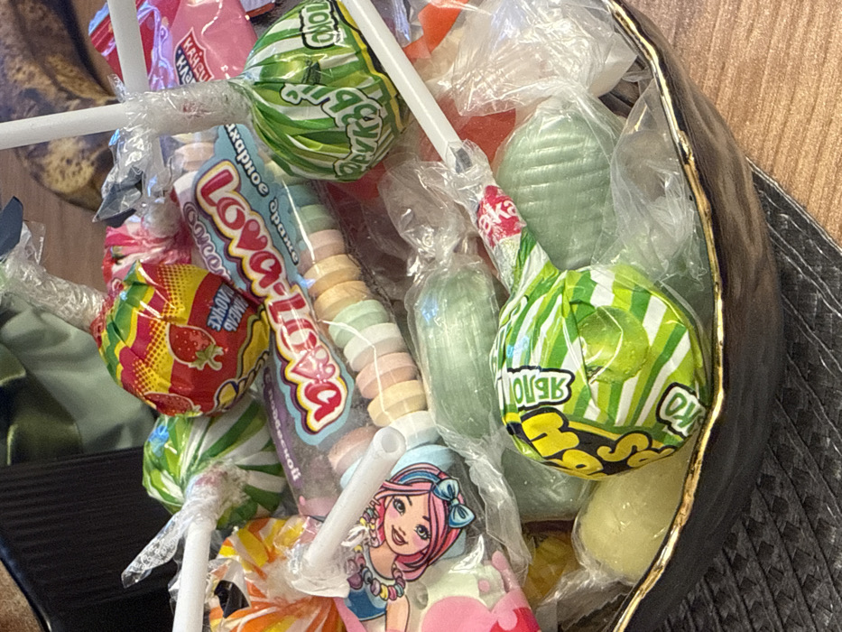 - "A dark-colored, irregularly shaped bowl with a gold-colored rim is shown filled with an assortment of individually wrapped candies and lollipops" by FM-VJm8n1, licensed under CC BY 4.0