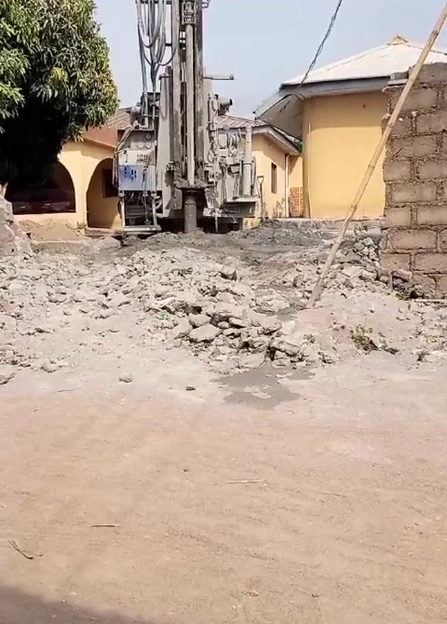 large, tall drilling rig positioned in a partially demolished area between two houses. The ground around the rig is covered in broken concrete and dirt. The rig itself is gray and has a tall mast-like structure with various hoses and machinery attached. To the left of the rig is a tree and a yellow house with an arched entryway. To the right is another yellow house and a partially constructed brick wall. Powerlines are visible overhead. The video appears to be taken on a clear day.