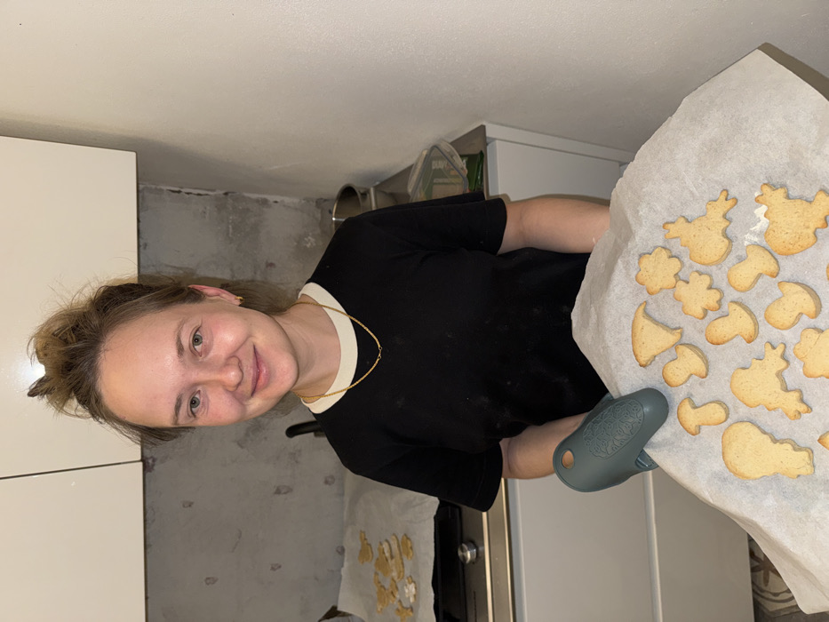 - "A woman smiles while holding a baking sheet of cookies in shapes like mushrooms, flowers, and animals" by FM-SHEMl1, licensed under CC BY 4.0