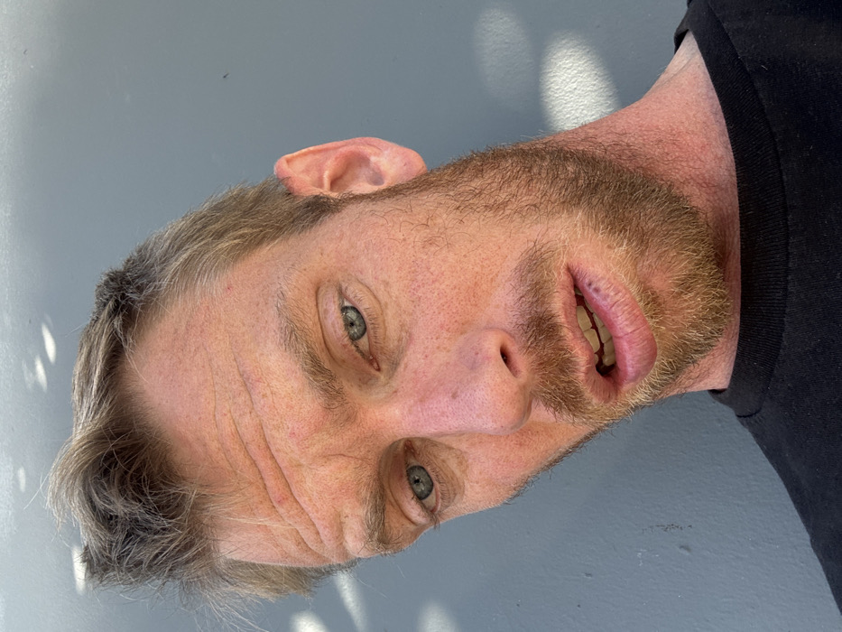 A close-up portrait of an adult male fills the frame, positioned against a plain blue-gray wall. The subject is Caucasian, with light brown hair showing graying strands, styled with a slight upward sweep at the front, and blue eyes. He has a short, light brown beard and mustache. His head is tilted approximately 15 degrees to the viewer's left, and his gaze is directed forward, meeting the camera. Prominent horizontal wrinkles are visible on his forehead. His lips are slightly parted, exposing upper and lower teeth. A distinct dark lesion is present on the lower lip, slightly to the viewer's left of the philtrum. He is wearing a black crew-neck t-shirt, visible at the bottom of the frame. The background wall exhibits blurred, abstract shadows, consistent with sunlit foliage or an overhead structure, suggesting an outdoor setting. The image contains no specific visual cues to determine the precise location within the city of Los Angeles, United States of America.