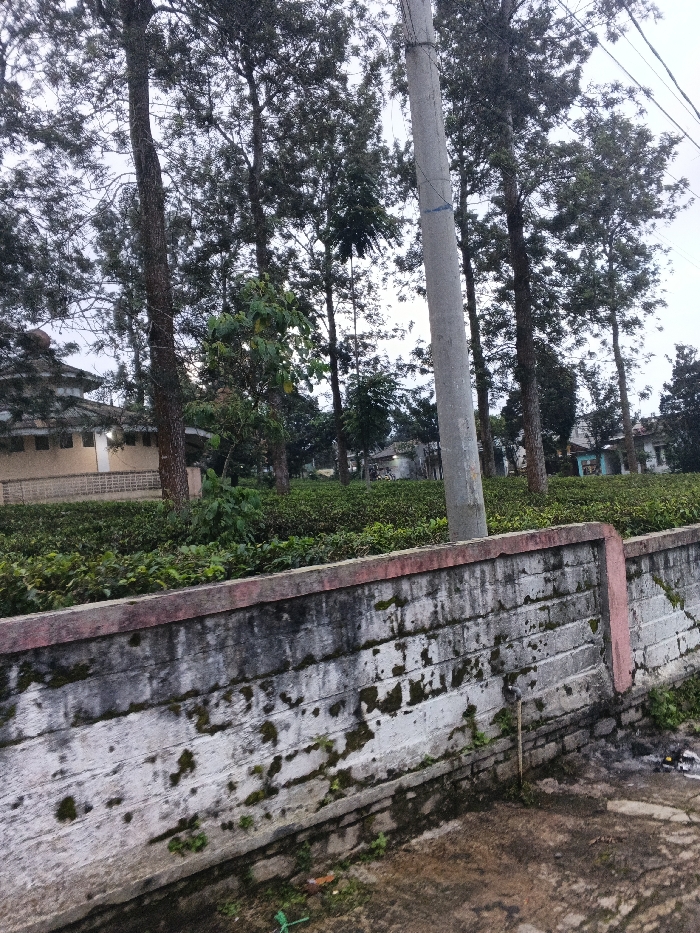 A gray concrete wall, stained with moisture and moss, runs along a road. Beyond the wall, a field of low, green plants stretches toward a line of tall, thin trees under an overcast sky. Buildings are visible behind the trees. A concrete pole stands among the trees. A bit of trash lies near the wall.