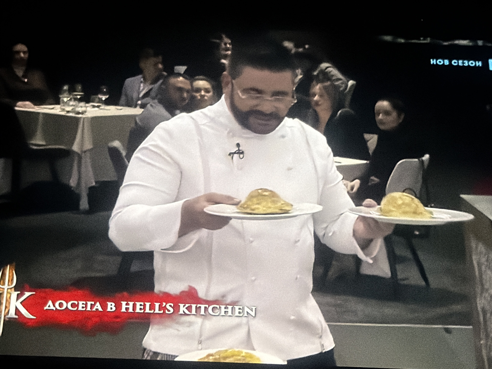 The image displays an indoor scene identified as a culinary show in Kazichene, Bulgaria