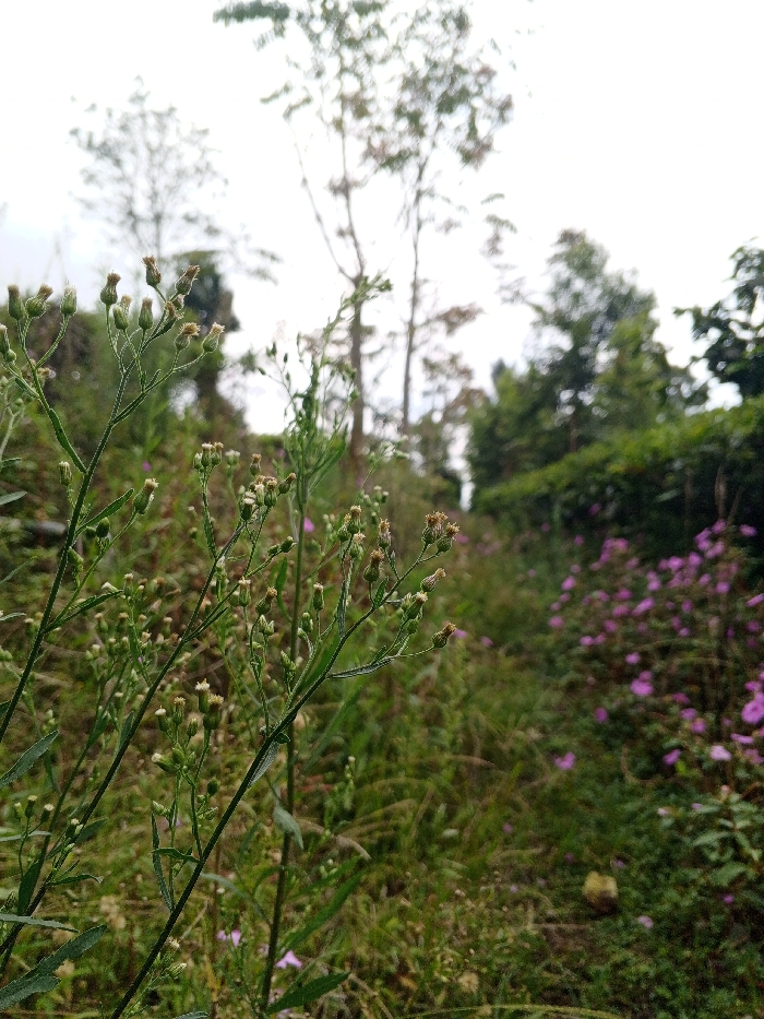 The image displays an uncultivated, natural outdoor environment, located in the city of Unknown, Unknown. The foreground is dominated by multiple slender green plant stalks featuring numerous small, developing flower buds with light brown or tan tips, some showing tiny white or pale yellow blossoms. These plants are in sharp focus. The midground consists of a dense, blurred expanse of green vegetation, including grasses and other foliage, with a distinct patch of small, vibrant purple flowers visible towards the right. The background features a heavily blurred array of trees against a bright, overcast white sky. Tall, slender trees with sparse canopies are visible alongside denser masses of dark green foliage. No human subjects, animals, man-made objects, or discernible actions are present within the frame.