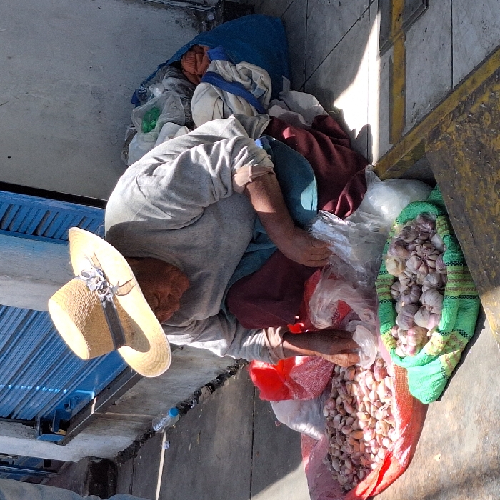 An elderly woman wearing a straw hat and gray sweatshirt sits beside a variety of bags filled with goods. She is in the process of filling a clear plastic bag with what appears to be garlic cloves from a large red bag. There is also a bag of garlic in a green patterned sack. Additional bags with unidentified contents are stacked nearby. The setting appears to be outdoors, possibly a market stall.