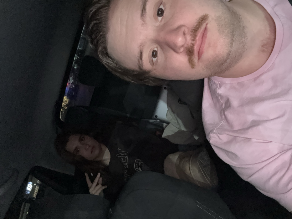 Two people are inside a car, likely at night. The car's interior is dark with glimpses of exterior lights. A man in a pink shirt, presumably taking the photo, occupies the right side, featuring a light complexion, mustache, and short brown hair. Beside him is a partially visible laptop. A woman sits in the back, holding up two fingers in a peace sign, and appears to have long brown hair, wearing a dark top. The car's dark seats are also visible.